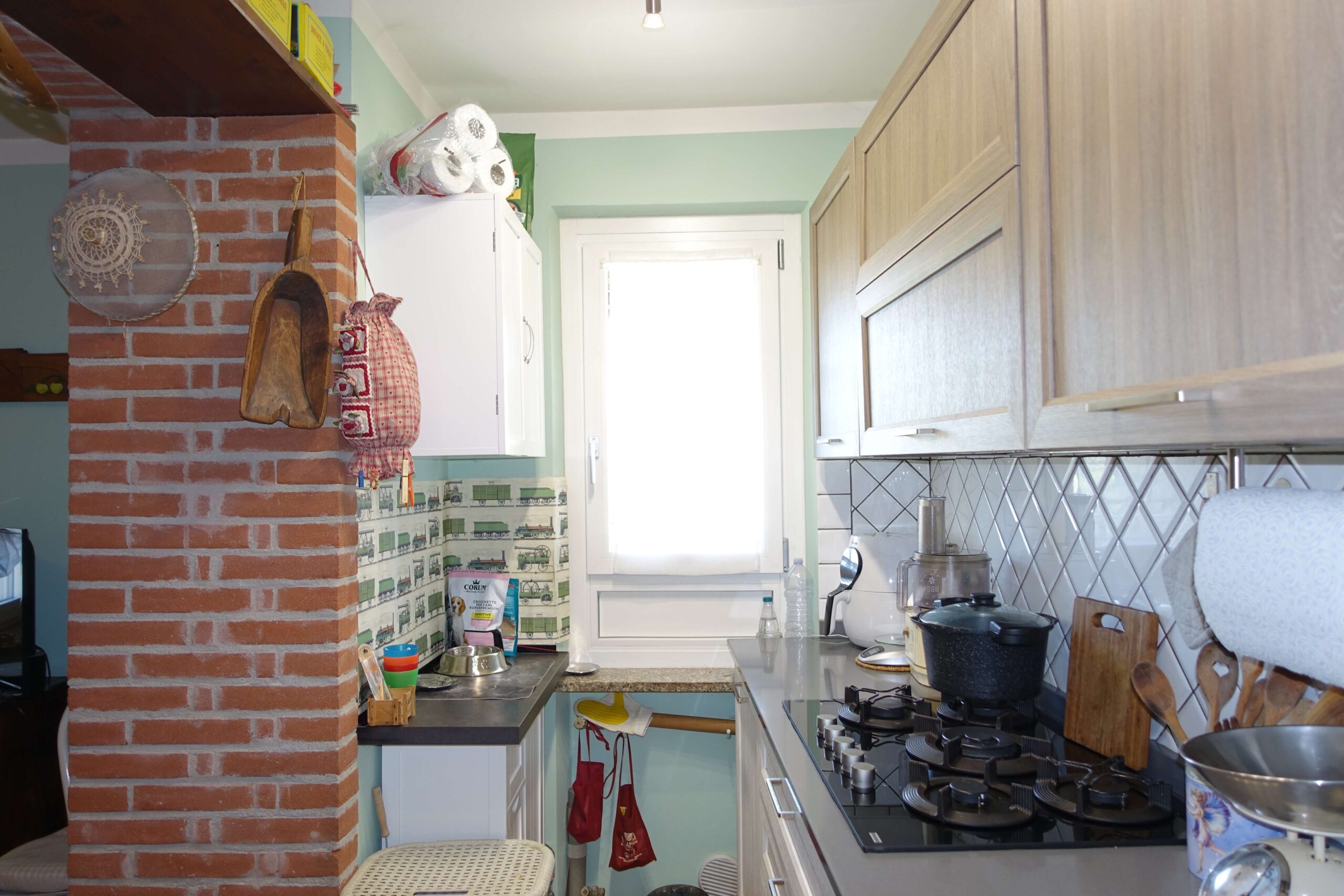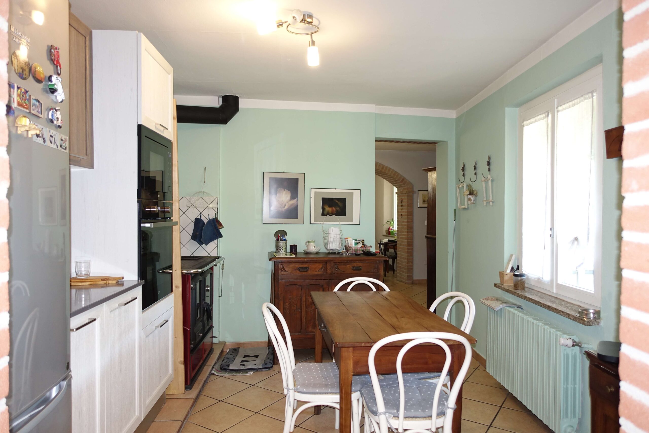 To the left: A new, spacious eat-in kitchen designed in a refined rustic style, featuring a stunning wood-burning stove.