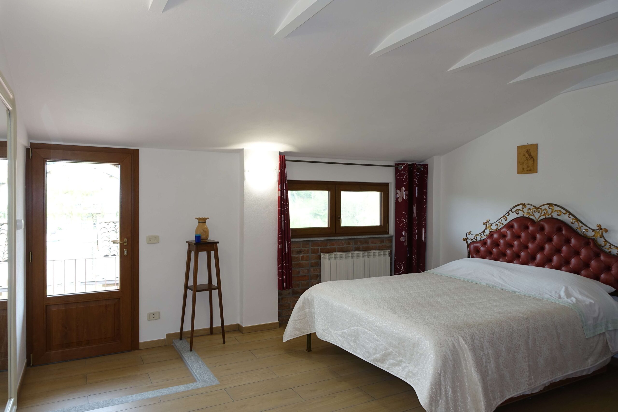 • A spacious master bedroom characterized by elegant white-painted wooden beam ceilings and a glass door opening onto the panoramic terrace.
