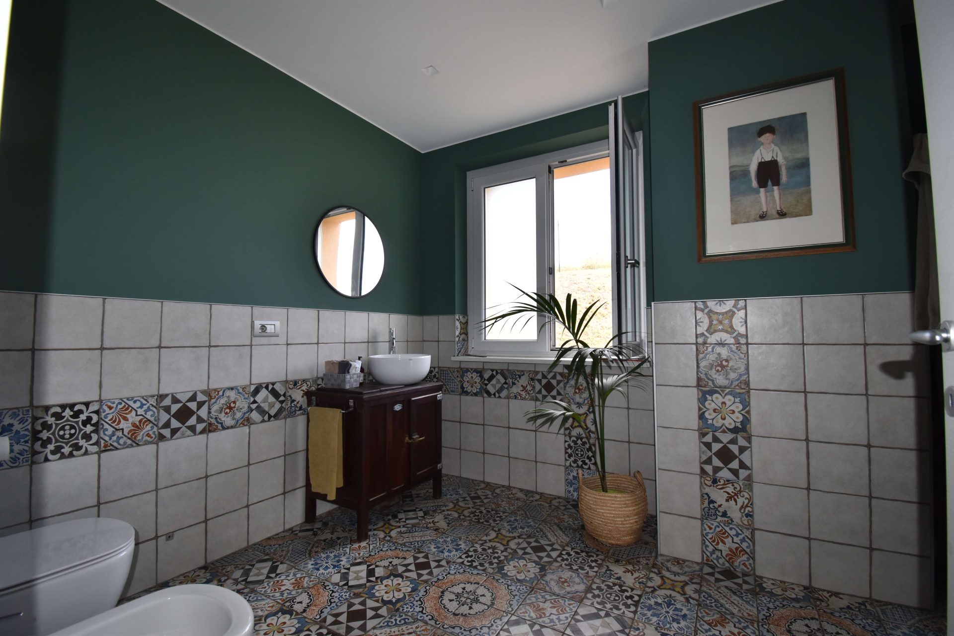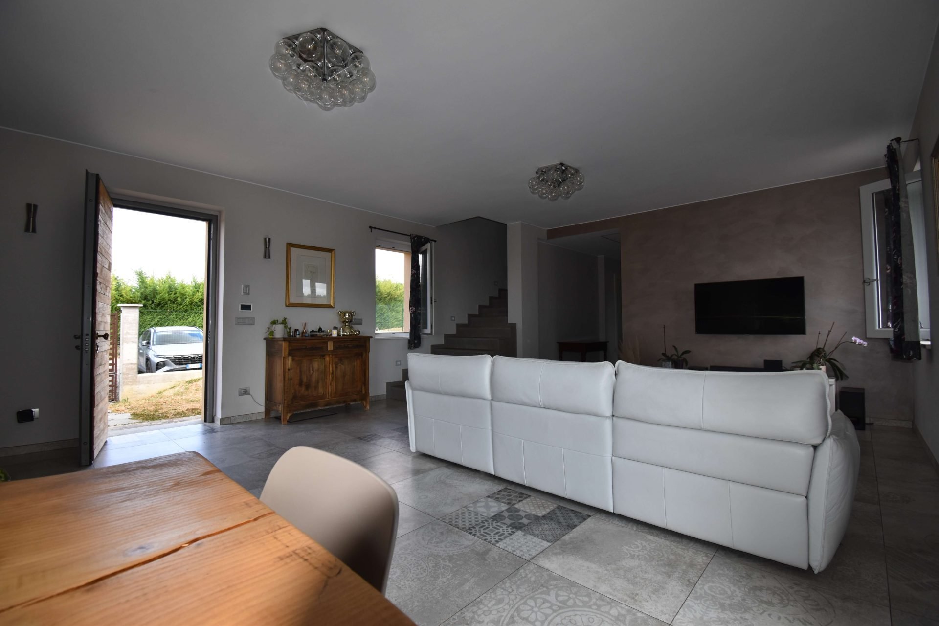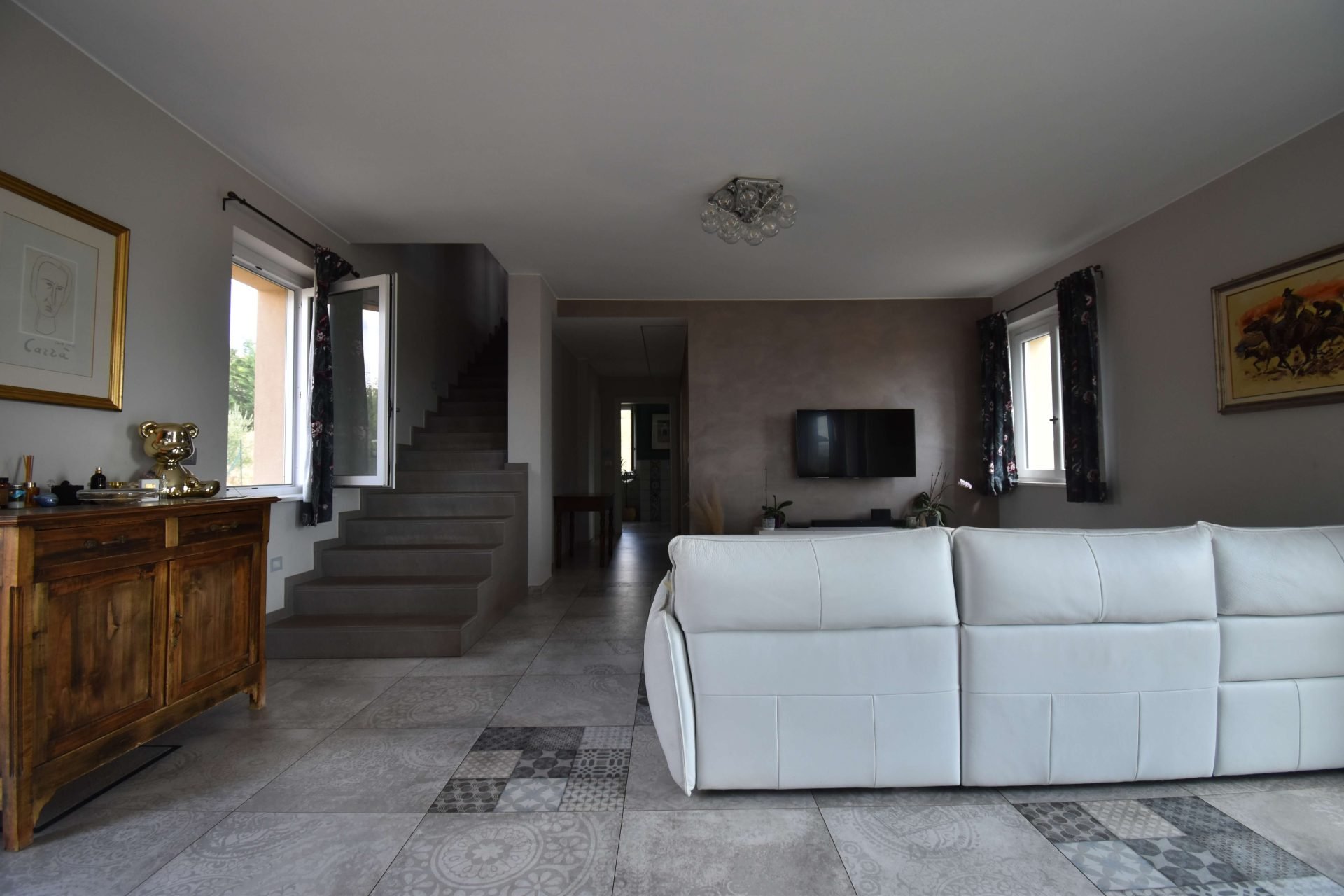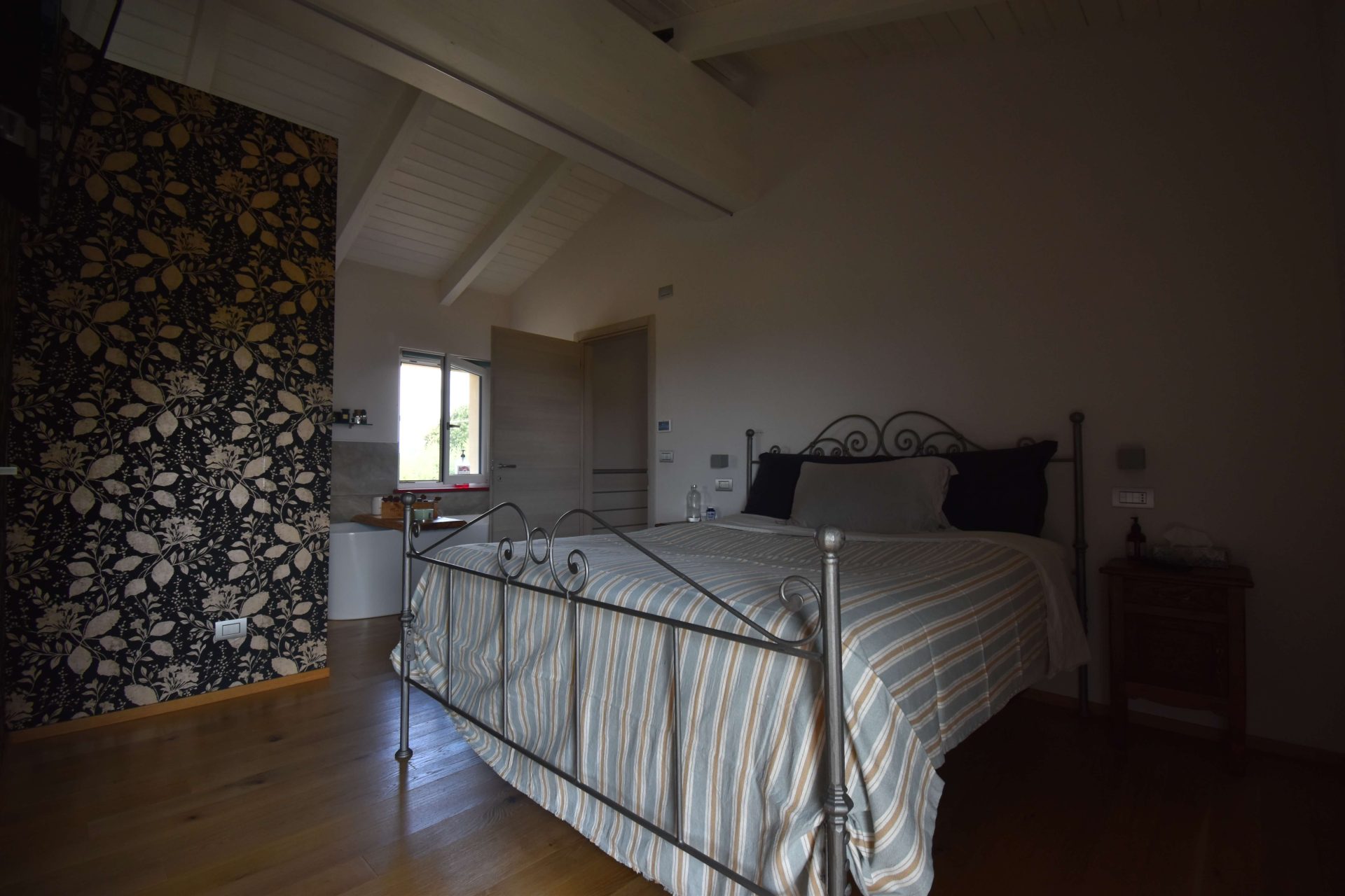The driveway leads to an entire basement floor of 290 sqm, masterfully designed to host a cosy tavernetta with a wood-fired oven, a spacious garage/storage area, a cellar, a study/office, the utility room, and a laundry with bathroom.