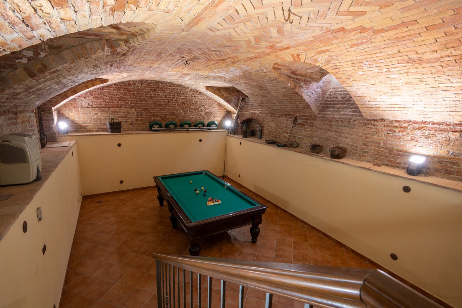 From the kitchen, a staircase leads directly to the large and atmospheric underground tavernetta/cellar: brick vaults in full view, intimate proportions, and a setting made for long dinners, tastings, and convivial evenings.