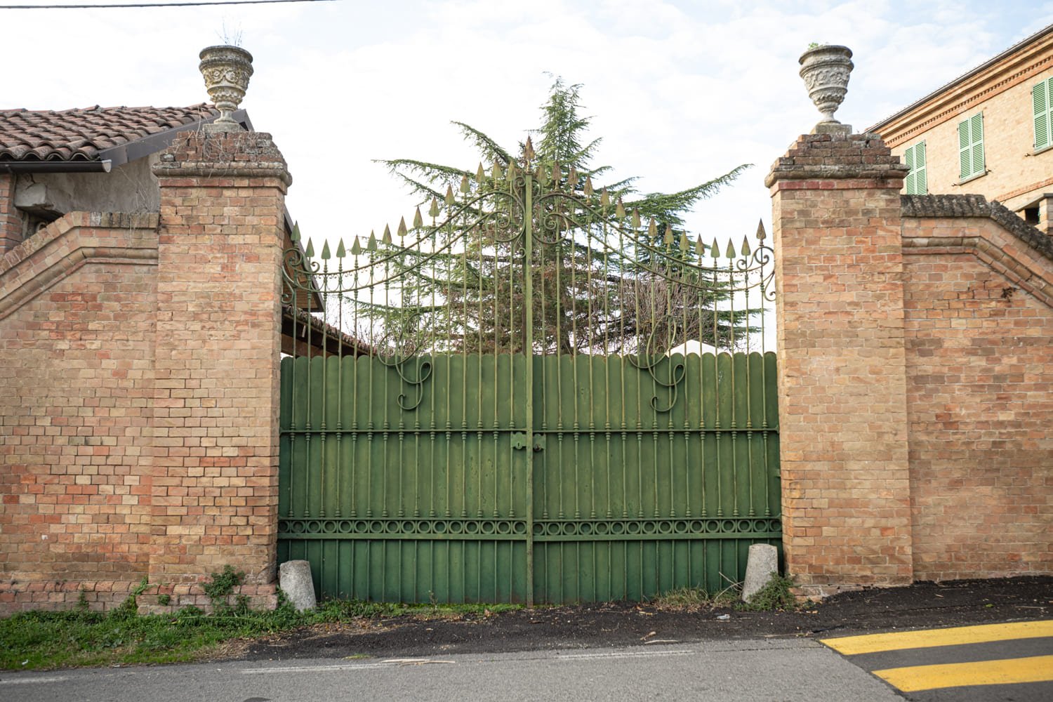 Beyond the entrance gate, a curated garden opens like a small private refuge, framed by the gentle lines of the Monferrato hills that unfold in the distance.