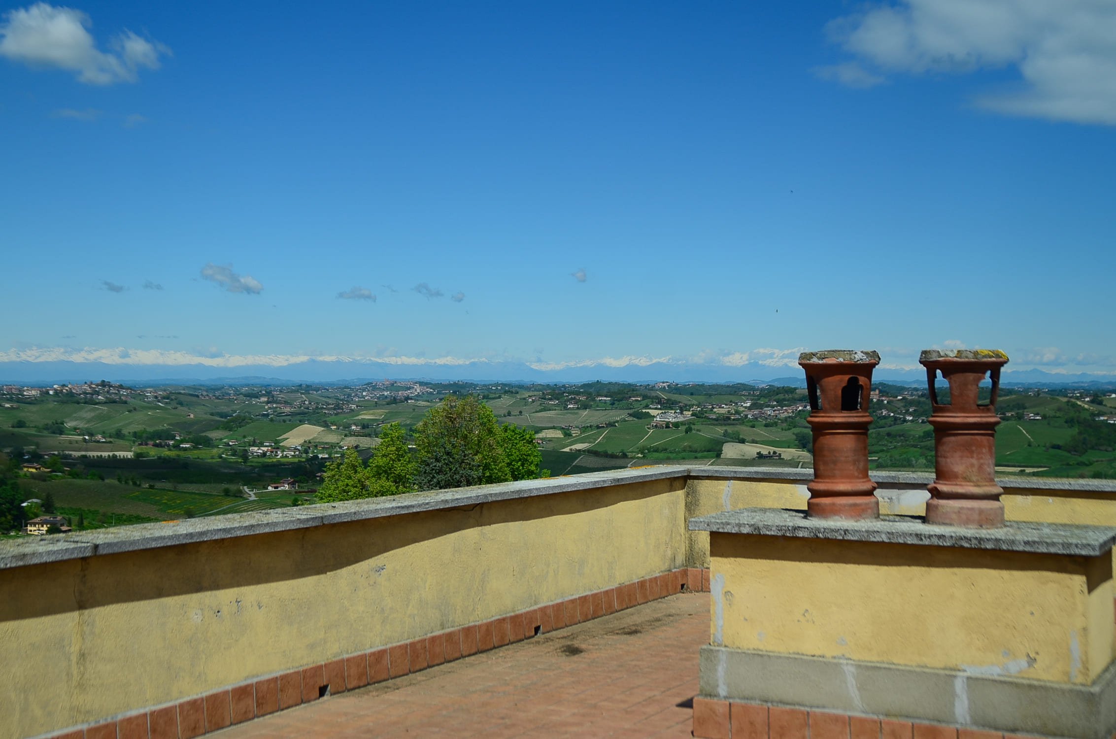 The ground floor houses a welcoming kitchen and living room with direct access to a small yet enchanting garden—ideal for lazy afternoons or quiet al fresco dinners. Climb up to the third floor and you’ll find a panoramic terrace that stretches out over the vineyards and the entire alpine arc. Why not imagine a jacuzzi here, where you can unwind with a view over the Langhe and Monferrato hills?