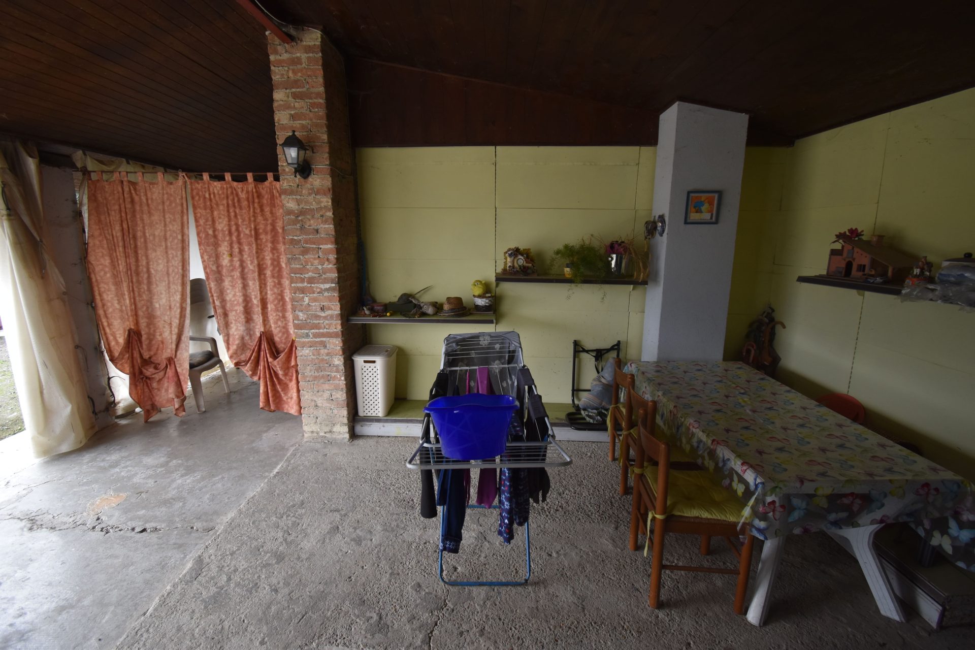 On the ground floor, the entrance opens onto a central hallway: to the right, a generous living room; to the left, a spacious kitchen, an open portico perfect for outdoor living, and a service/storage room.