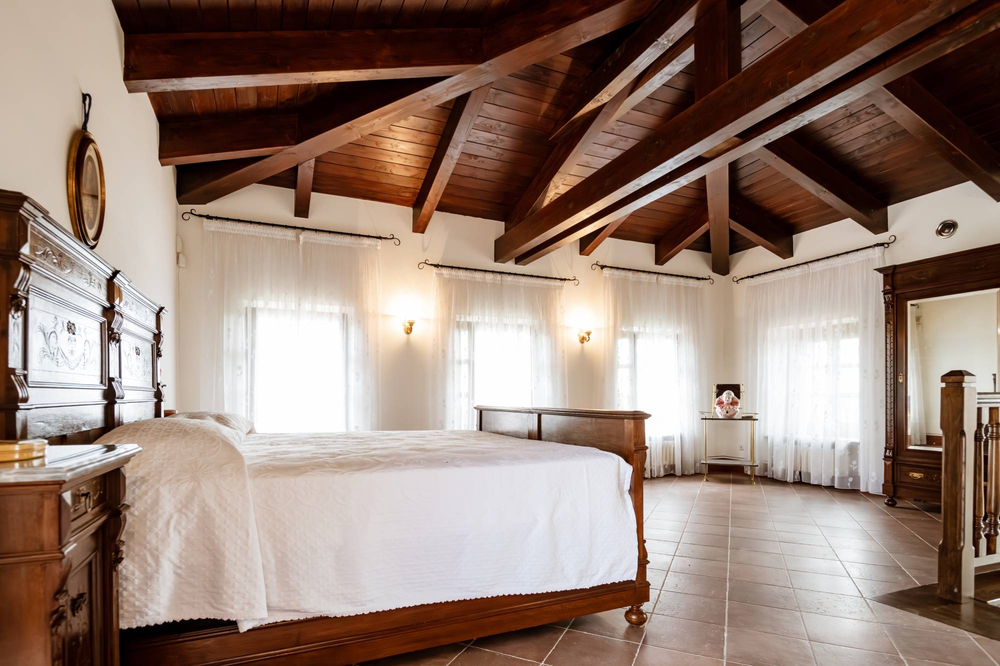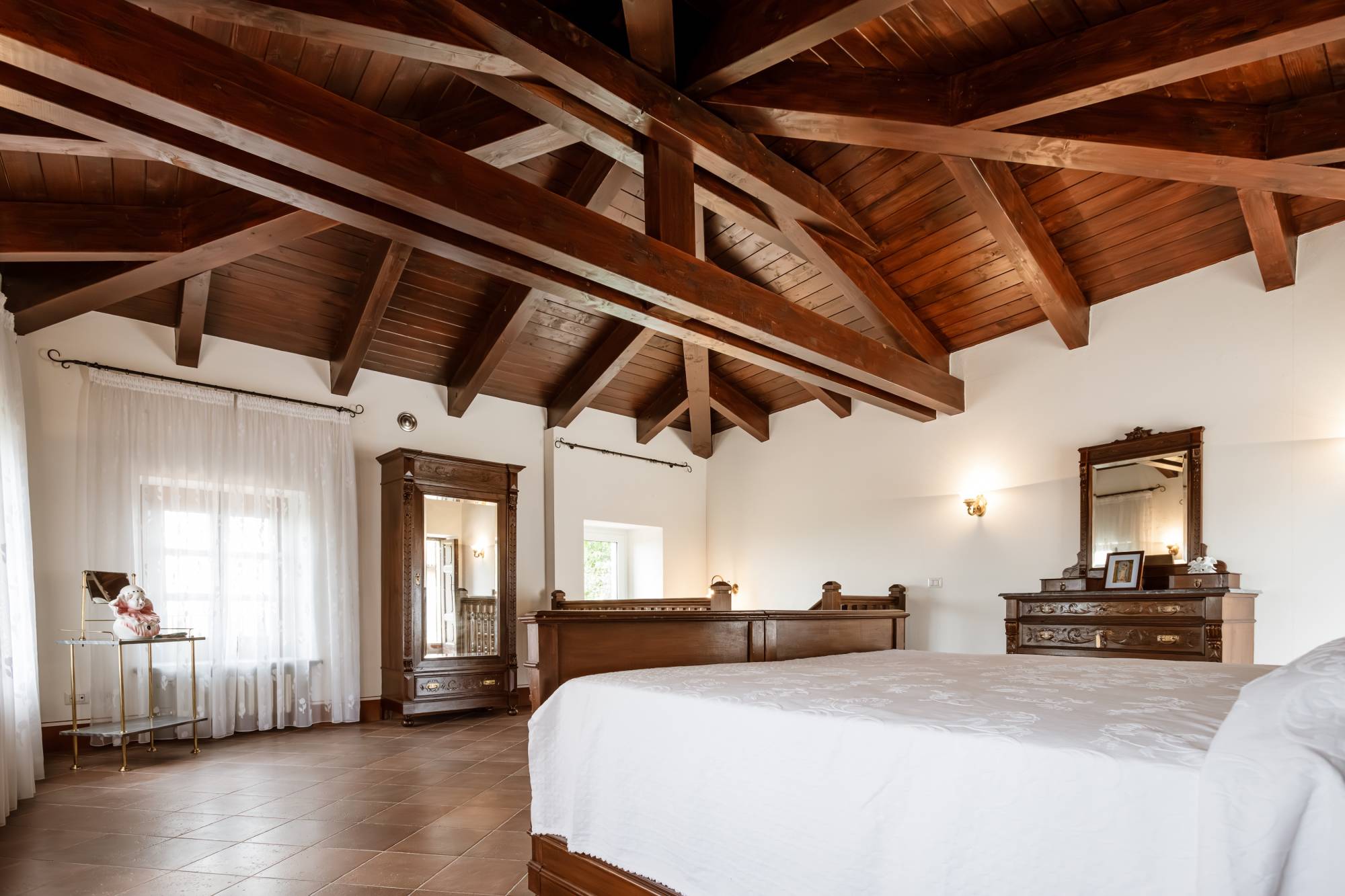 Continuing the staircase you reach the master bedroom: a true luxury! Spacious, bright and with a roof with exposed beams. Something special!