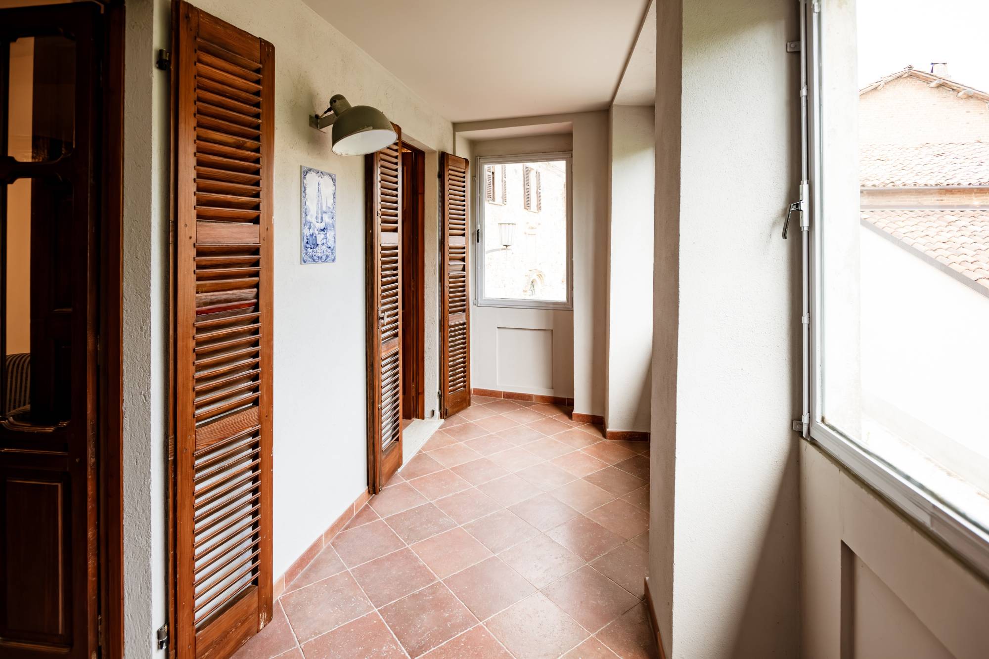 A warm wooden staircase leads to the first floor where there is a bathroom and two bedrooms, one of which has access to a covered and glazed terrace.