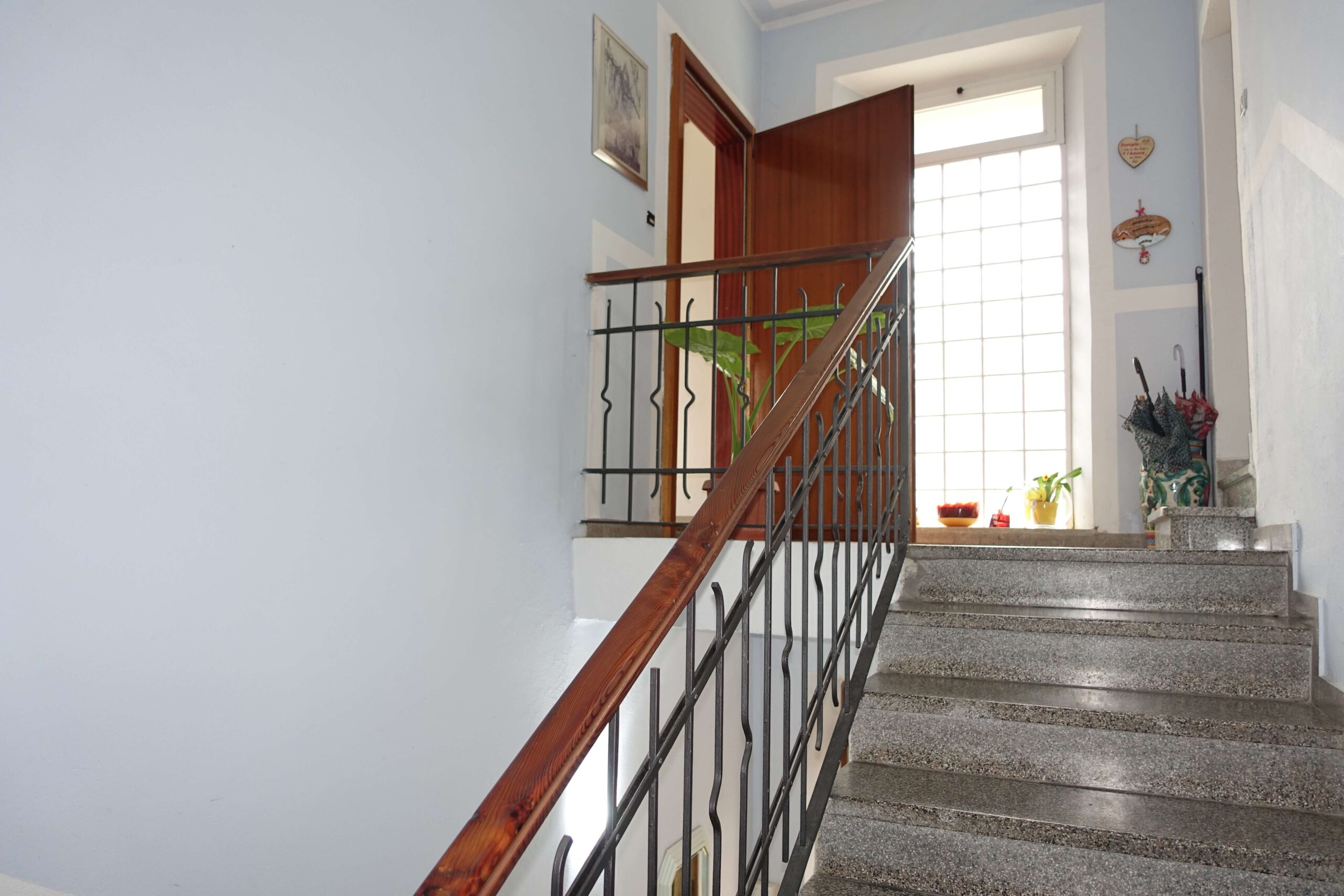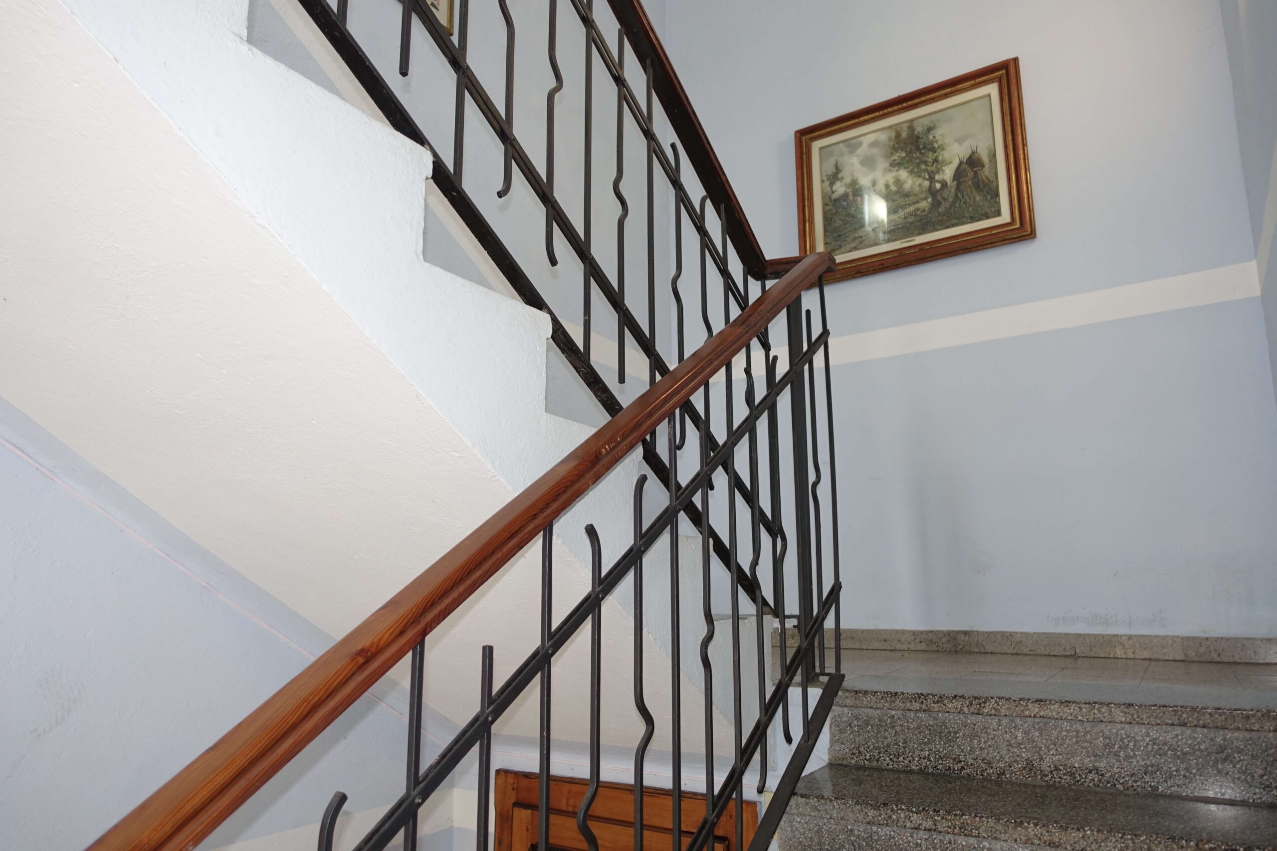 The apartment, accessed via a shared staircase serving only one other neighbor, opens into a spacious and bright open-plan living/kitchen area, designed for modern living and featuring access to a long private balcony. A hallway leads to the sleeping area, which includes: