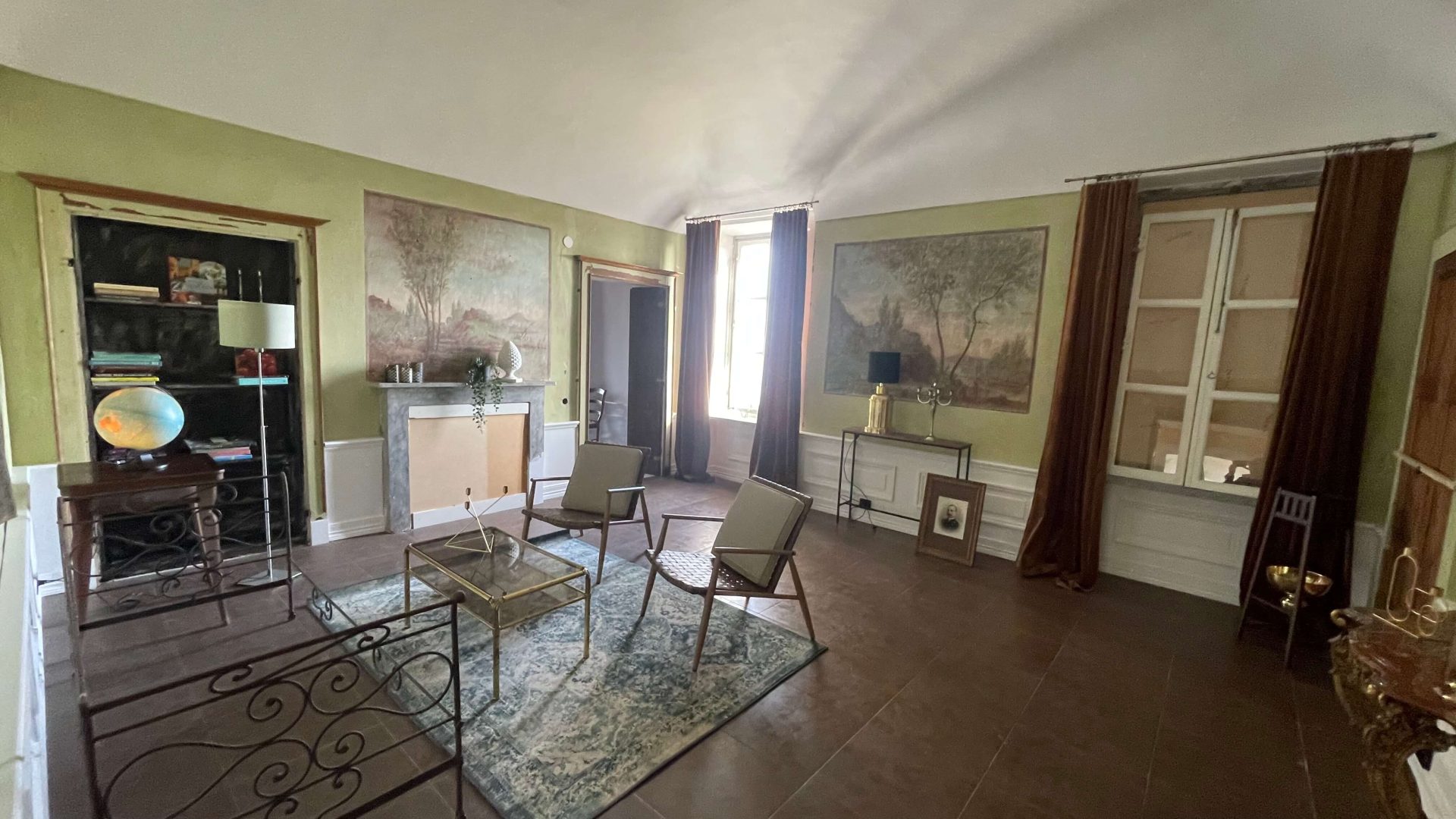 The newer wing of the property is a stunning fusion of old and new, featuring an expansive open-concept living kitchen. The space is highlighted by exposed brick vaulted ceilings and is fully equipped with appliances and large counter space to cater to all your culinary endeavors. Adjacent to the kitchen, a convenient storage room sits next to an elegant formal dining room, where antique furnishings, intricate frescoes, and a wood-burning fireplace create a captivating atmosphere. A living room and an elegant studio complete the ground floor.