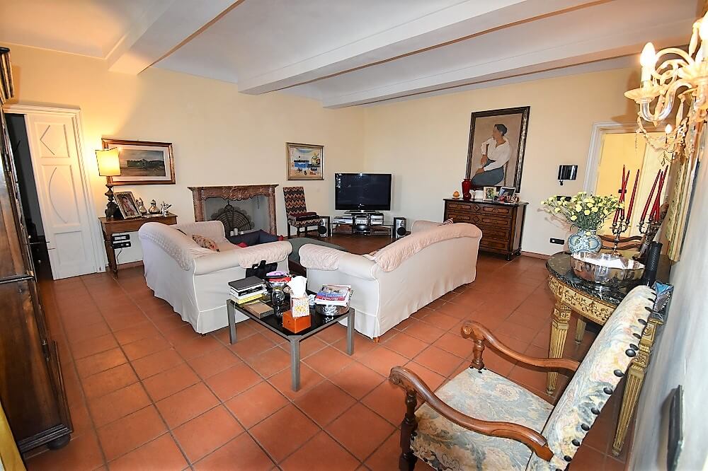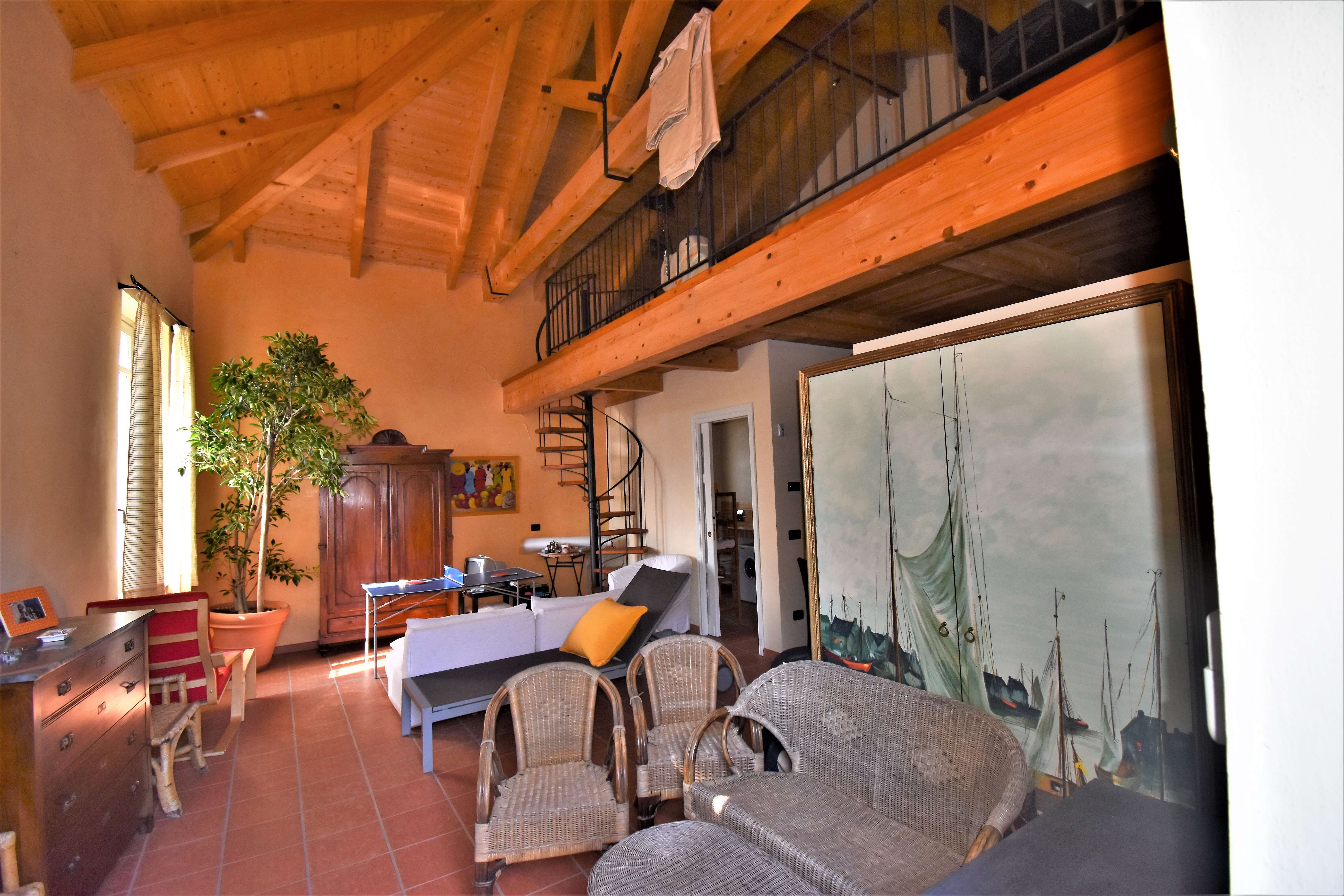 On the ground floor there is a huge living room and the kitchen with a brick fireplace that makes the room cosy even on cold winter days. Then there are two bedrooms with respective bathrooms and the living room with a small cozy study overlooking the garden with its own patio.